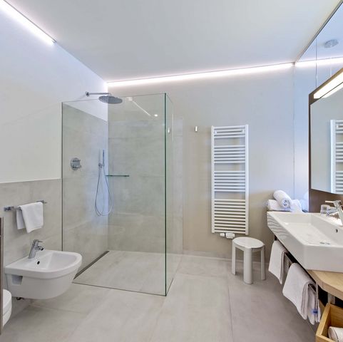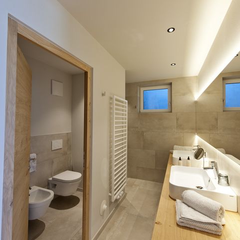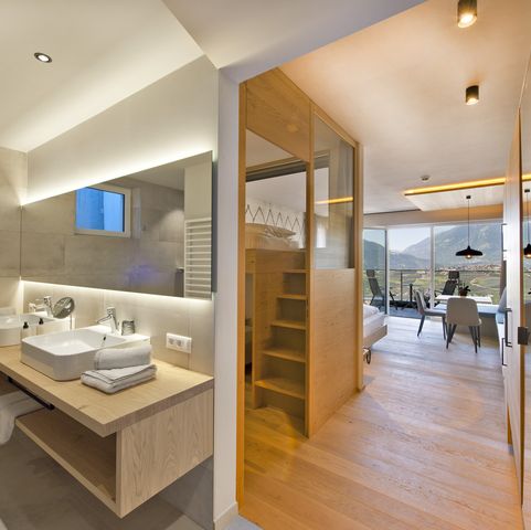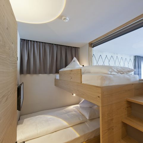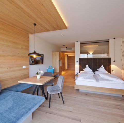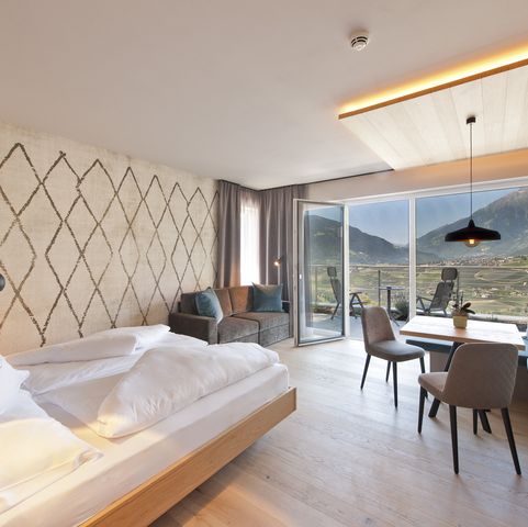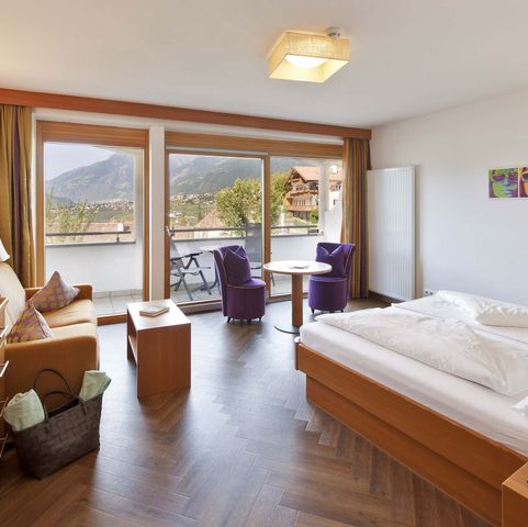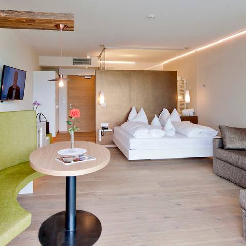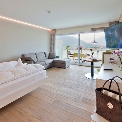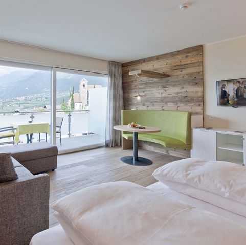 Camera doppia con balcone a est e sole del mattino. Bagno con doccia, WC, asciugacapelli, specchio da trucco, TV satellitare, telefono e cassaforte. Con arredi in rovere o legno di cirmolo. Prenotabile anche per uso singolo.